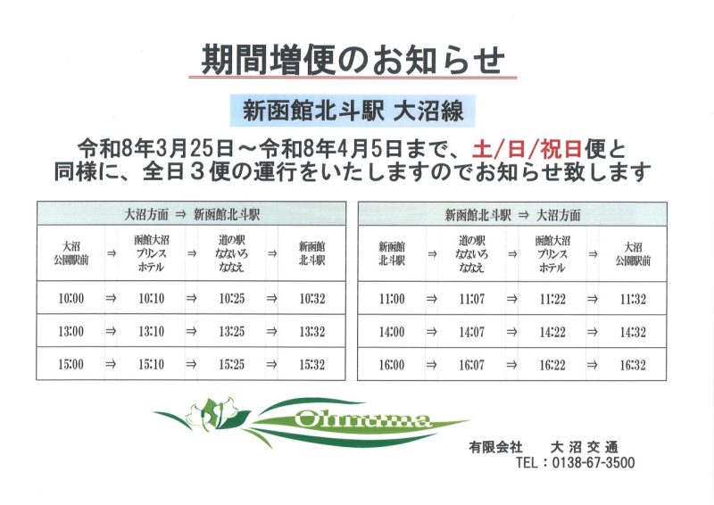 2026年3月25日より2026年4月5日まで、期間増便運行致します。
